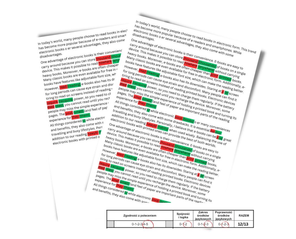 Wypowiedź pisemna to aż 22% wyniku całkowitego. Samemu nie jesteś w stanie ocenić czy twoje wypowiedzi są poprawne z wytycznymi CKE oraz ile punktów zdobędą. Ja zrobię to za Ciebie.