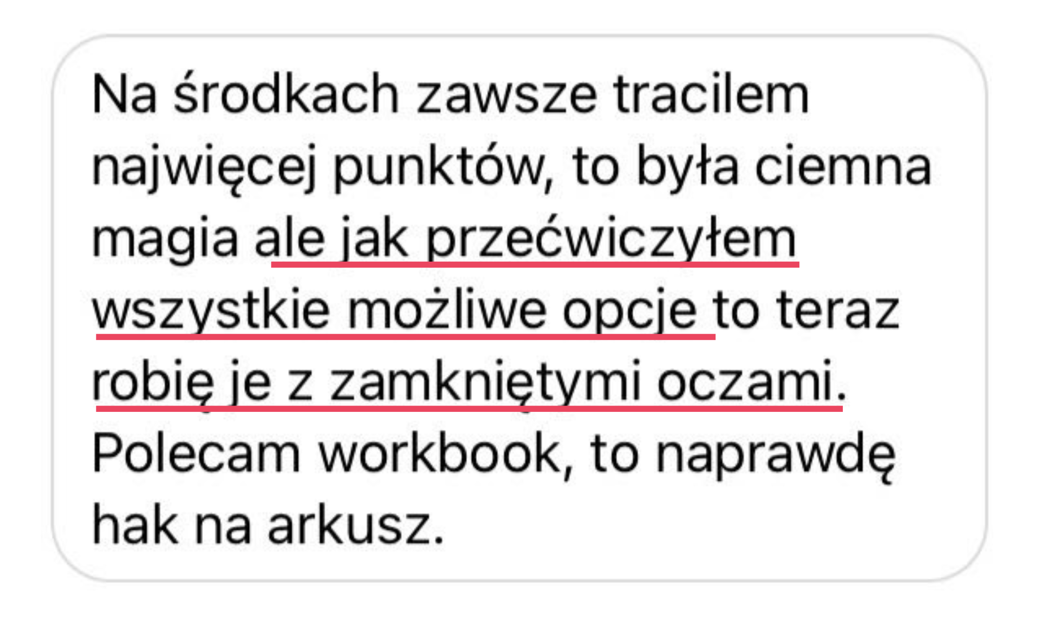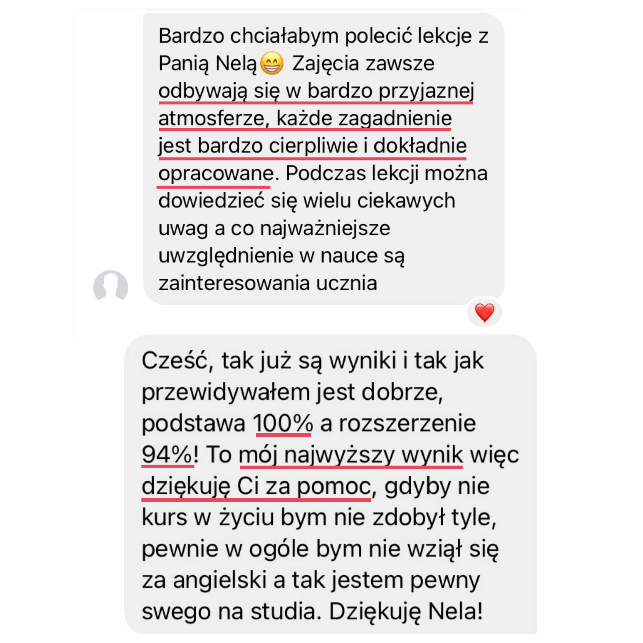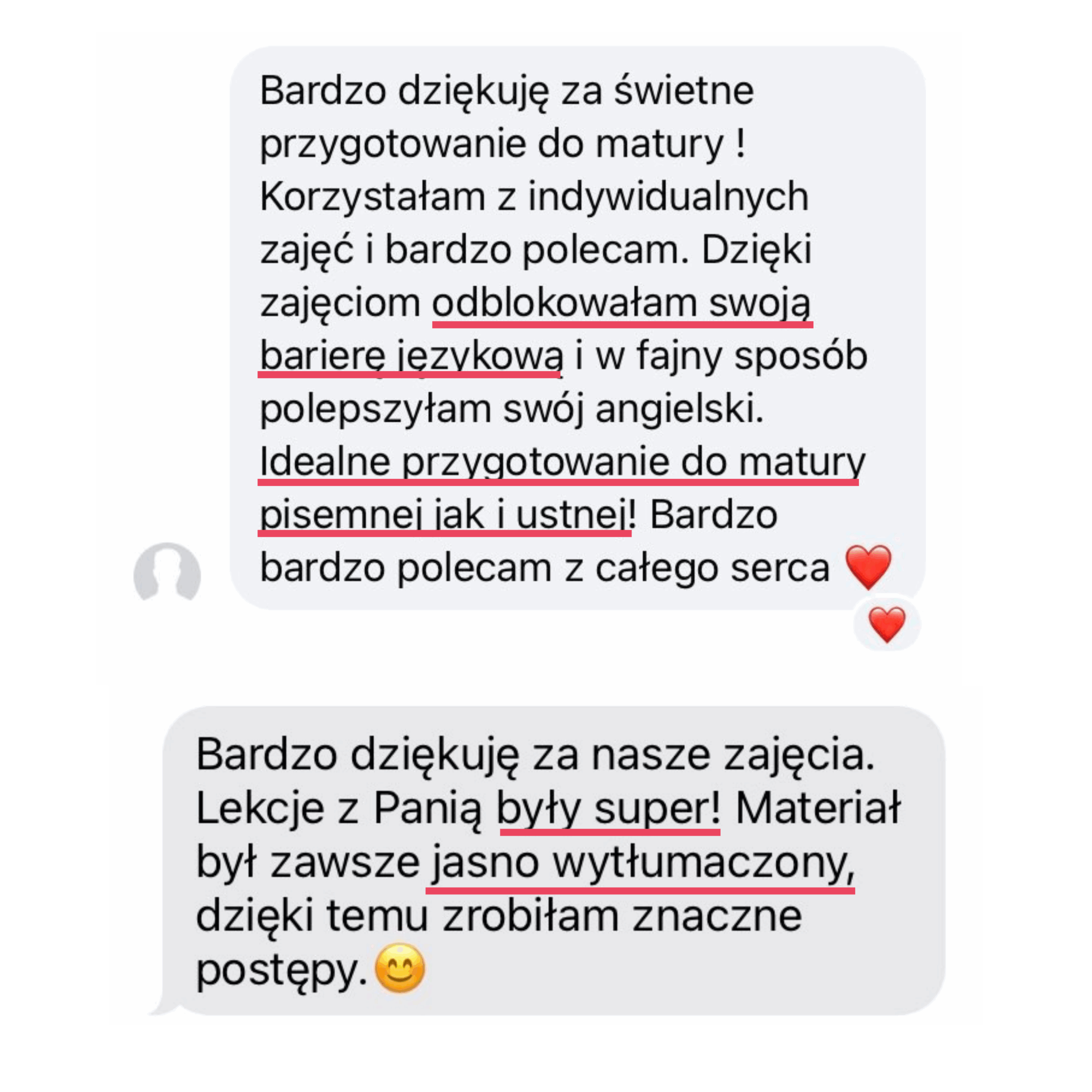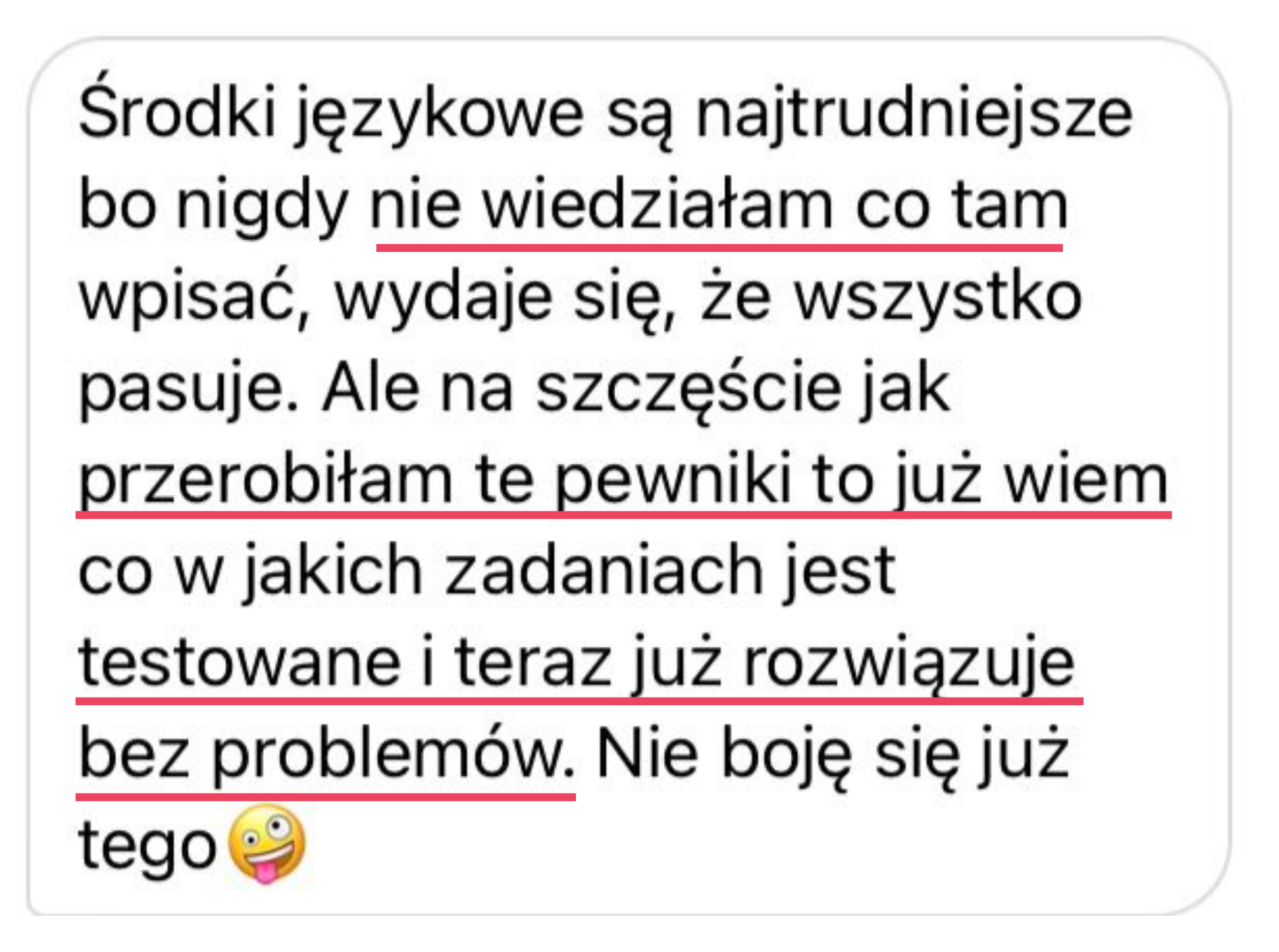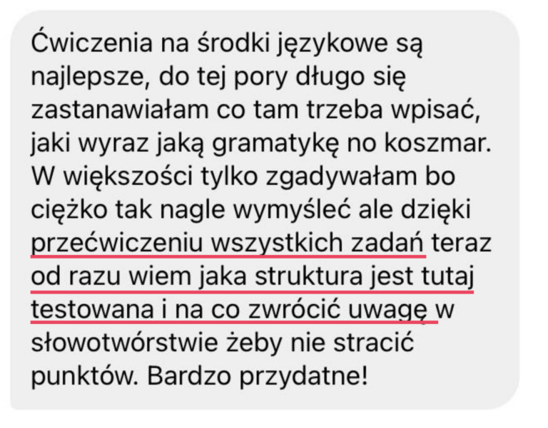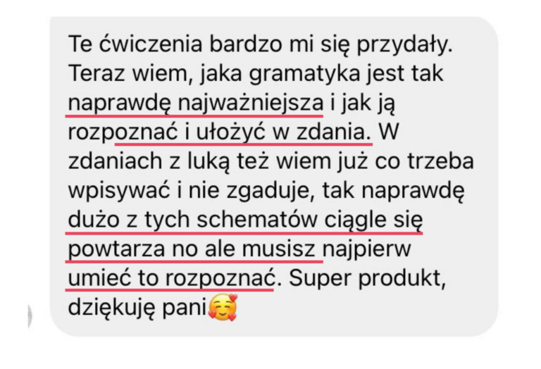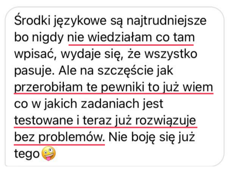 Moja wiedza egzaminacyjna pozwoli Ci opanować nie tylkoniezbędne i tak pomocne strategie egzaminacyjne, ale także pomoże Ci zwiększyć pewność siebie i rozwinąć swój potencjał językowy. Zdradzę Ci sekret, nie musisz opanować wszystkiego, by spokojnie zdać swój egzamin czy zdobyć wysoki wynik +80%. Moje metody są sprawdzone na setkach uczniów i oparte na dziesiątkach przeanalizowanych arkuszy.