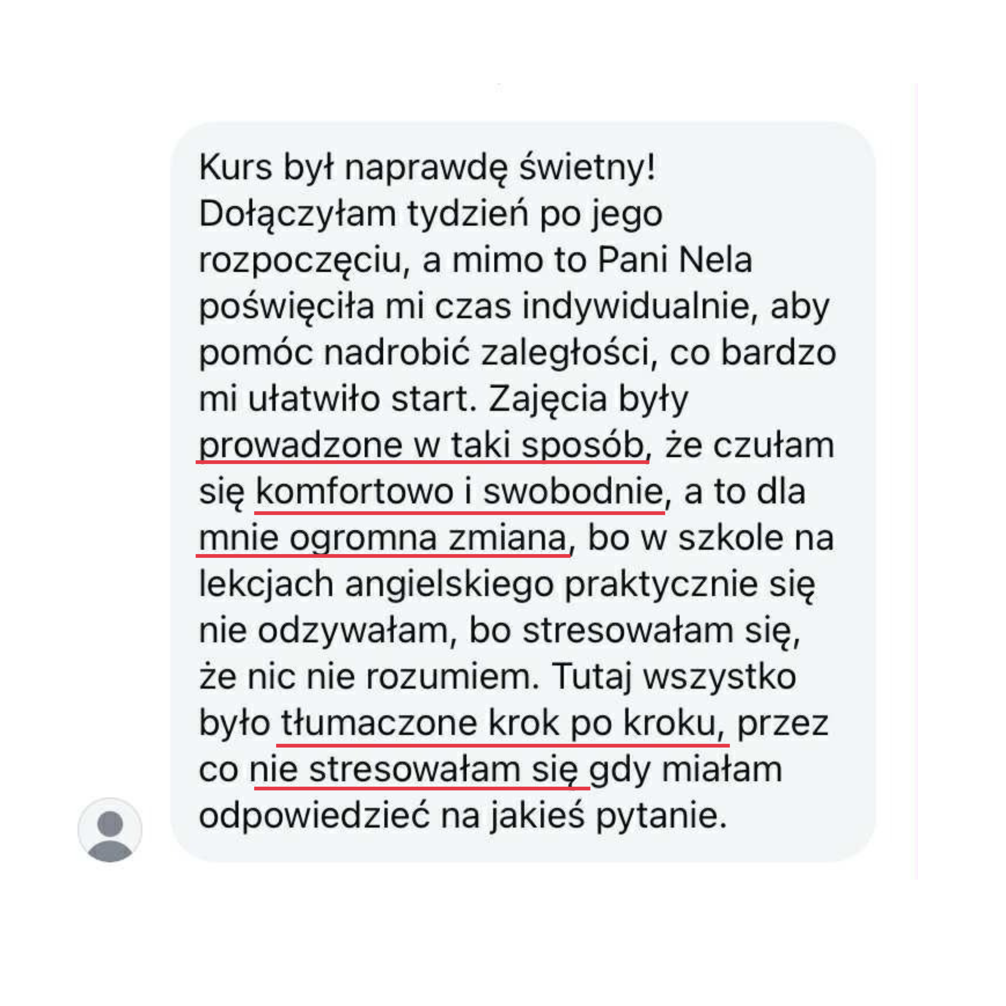Nasz kurs grupowy oferuje także indywidualne podejście i opiekę dla każdego uczestnika. Jeżeli potrzebujesz dodatkowej pomocy możesz napisać na grupie lub mailowo z czym potrzebujesz pomocy, nauczyciele często dosyłają też dodatkowe materiały, jeżeli uczniowie tego potrzebowali. Możesz także przyjść na konsultację, by omówić dane zagadnienie z nauczycielem bezpośrednio.