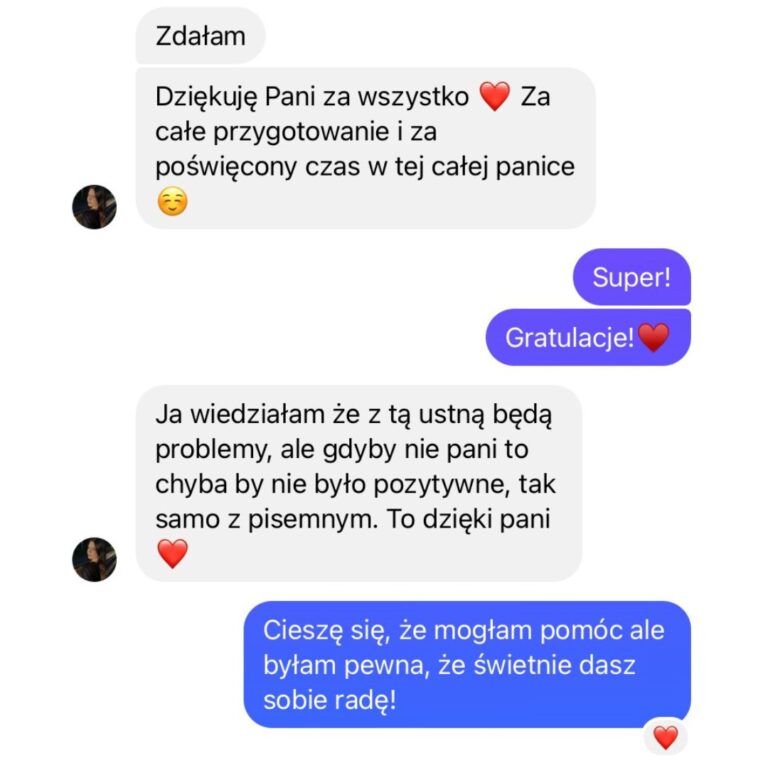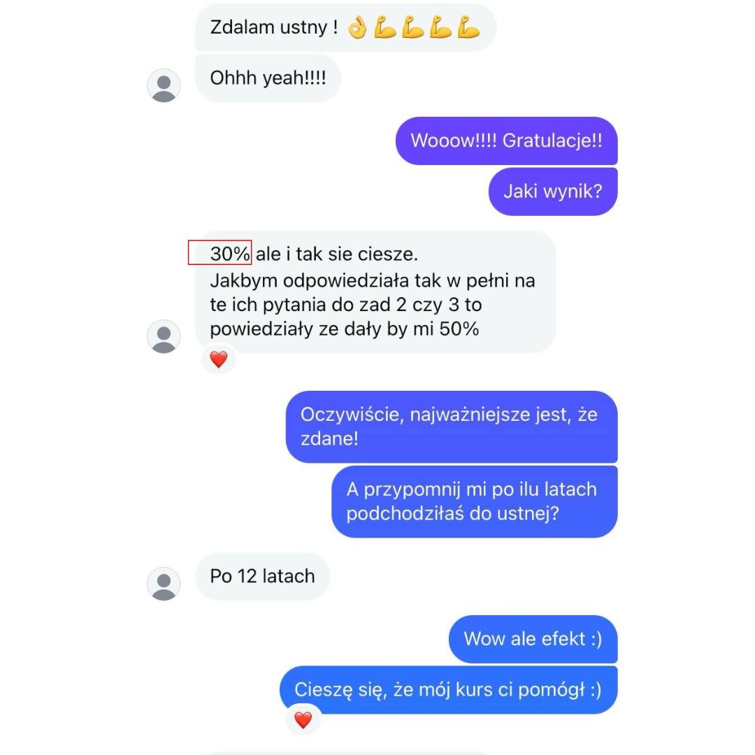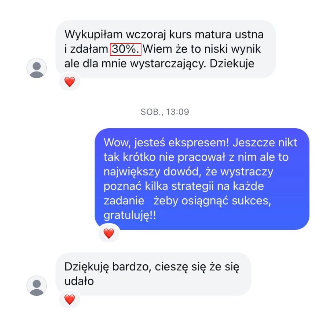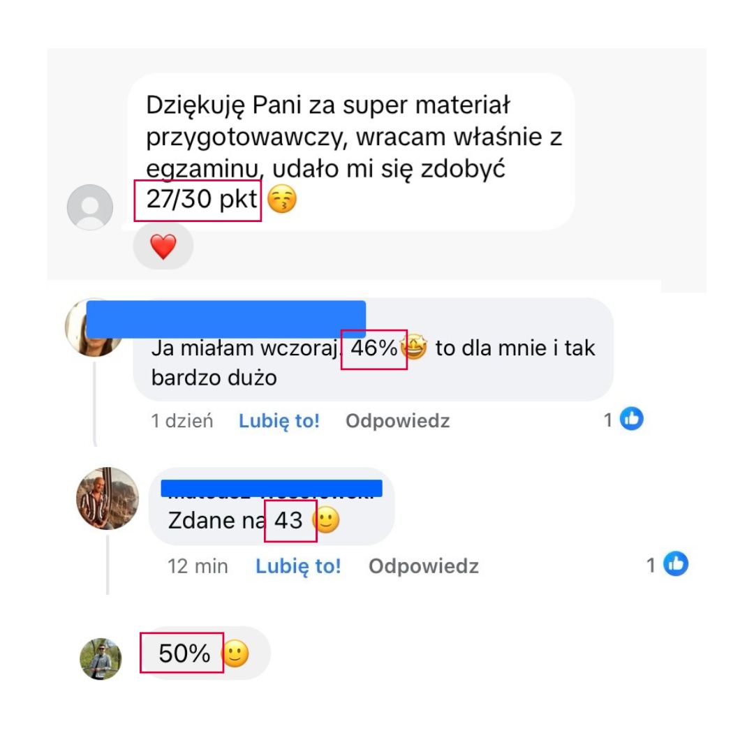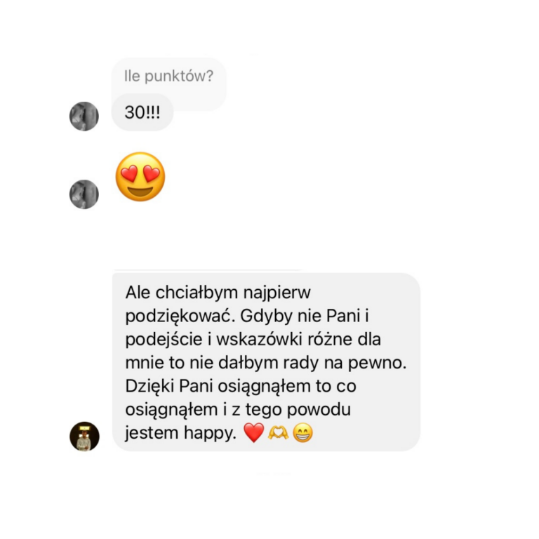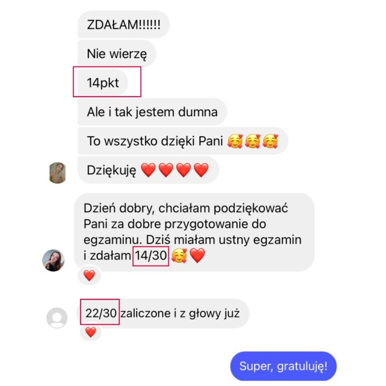 Moja wiedza egzaminacyjna pozwoli Ci opanować nie tylkoniezbędne i tak pomocne strategie egzaminacyjne, ale także pomoże Ci zwiększyć pewność siebie i rozwinąć swój potencjał językowy. Zdradzę Ci sekret, nie musisz opanować wszystkiego, by spokojnie zdać swój egzamin czy zdobyć wysoki wynik +80%. Moje metody są sprawdzone na setkach uczniów i oparte na dziesiątkach przeanalizowanych arkuszy.