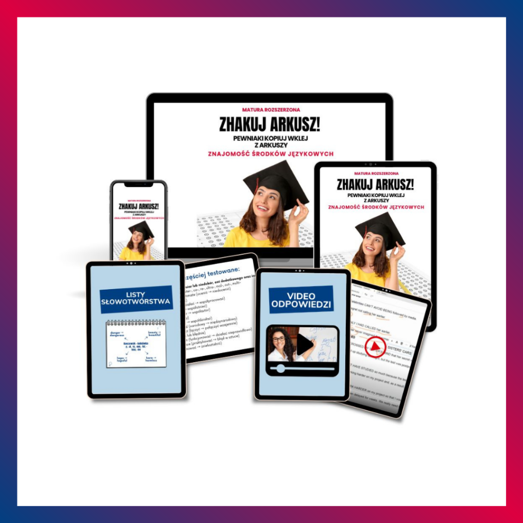 Zobaczysz, że transformacje i gramatykalizacja mają swoje powtarzalne schematy. Uczysz się ich rozpoznawania i przekształcania zgodnie z kluczem. Do tego omawiamy strategie egzaminacyjne: jak nie stracić punktu, gdzie w zdaniach są podpowiedzi, czego nigdy nie robić, na co zawsze zwrócić uwagę.