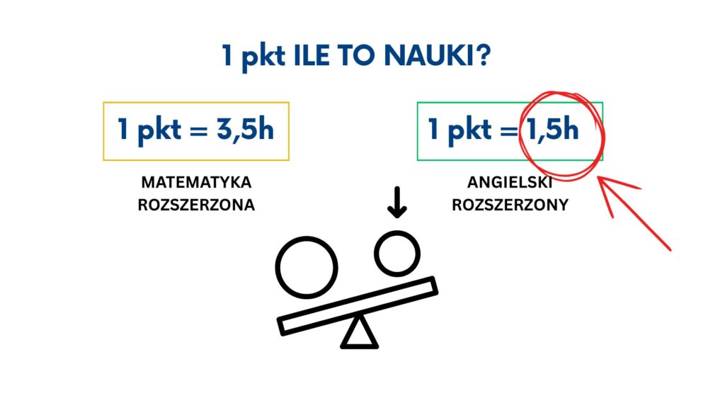 Zdobycie 1 punkty z matematyki rozszerzonej zajmuje średnio ok 3,5 godz. w porownaniu z angielskim gdzie na 1 punkt uczysz się średnio 1,5 godz.