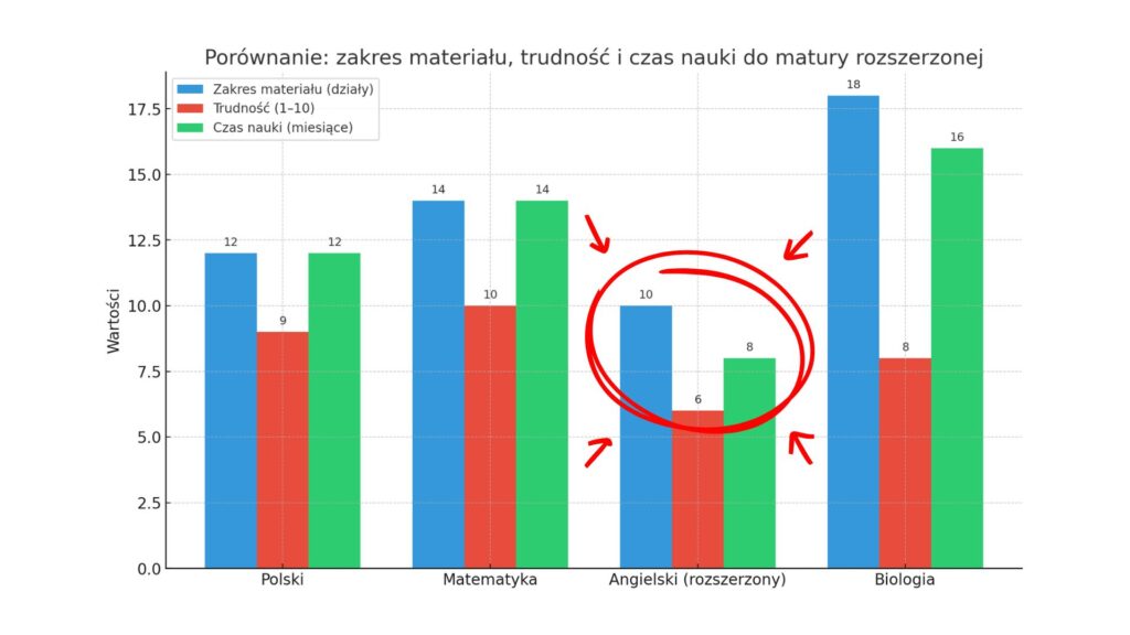 Dodatkowo, w przeliczeniu ilości materiału i jego trudności zdobycie wysokiego wyniku z angielskiego jest o ponad połowę krótsze niż z innych rozszerzeń.